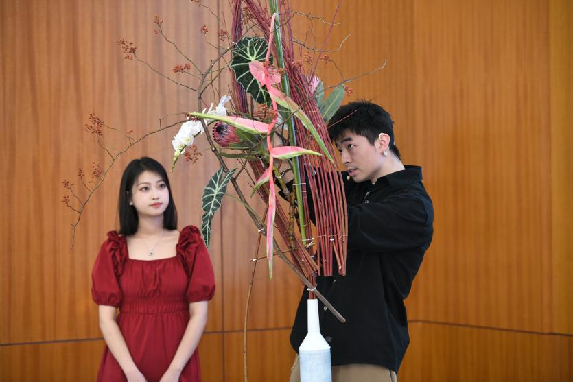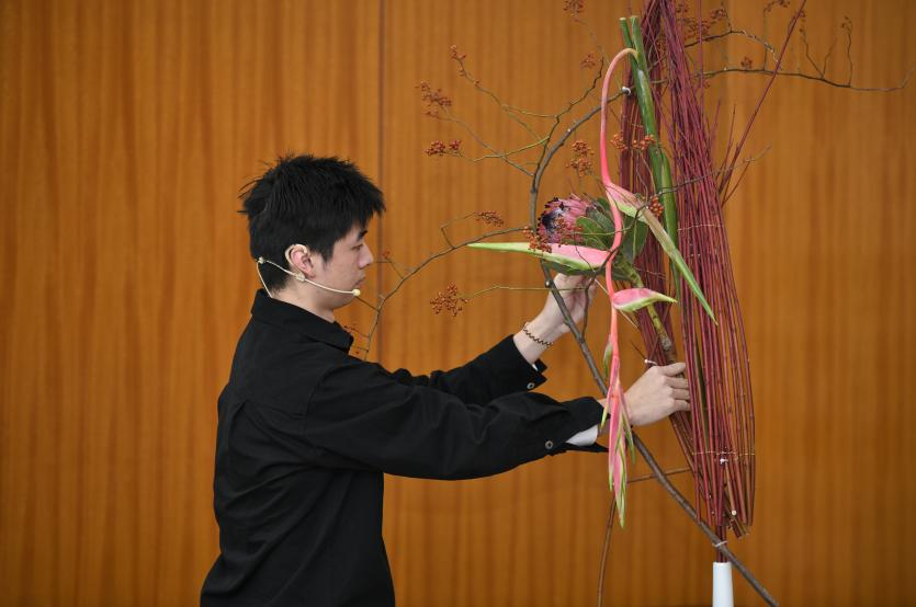 第四十四届世界技能大赛花艺冠军潘沈涵在悠扬曲乐伴奏下进行花艺展示。借草木抒发心志,以插花表达情韵,“青春之火,超越自我”是潘沈涵对于插花作品的注释。插花过程是有张力创造美的过程,一枝一叶、一瓣一朵皆是无声的语言,心灵的互动。精美且独特的插花技艺为开幕式会场添光增彩。